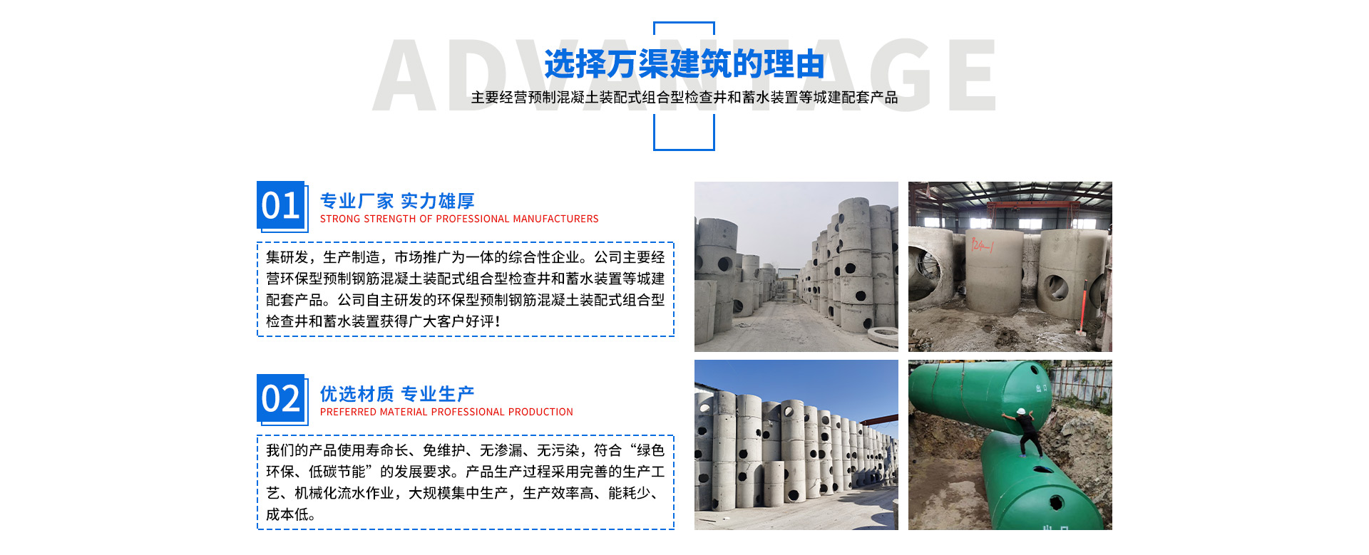安徽萬渠建筑科技有限公司是集研發(fā),生產(chǎn)制造,市場(chǎng)推廣為一體的綜合性企業(yè)。公司主要經(jīng)營環(huán)保型預(yù)制鋼筋混凝土裝配式組合型檢查井和蓄水裝置等城建配套產(chǎn)品。產(chǎn)品生產(chǎn)過程采用獨(dú)特的生產(chǎn)工藝,機(jī)械化流水作業(yè)。產(chǎn)品大規(guī)模生產(chǎn),生產(chǎn)效率高,耗能少,成本低,產(chǎn)品使用壽命長、免維護(hù)、無滲漏、無污染,符合“綠色環(huán)保,低碳節(jié)能”的發(fā)展要求,是傳統(tǒng)磚砌井池的理想替代產(chǎn)品。